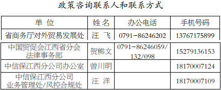 政策起止时间:从我省启动一级响应之日起,视疫情影响情况而定。操作流程:关于办理“新型冠状病毒感染的肺炎疫情不可抗力事实证明”,省内企业可在线上认证平台(http://www.rzccpit.com/)申请办理,亦可与当地贸促会联系办理。关于出口信用保险及融资服务,对已开通“信保通”的外经贸企业,企业可在线上办理出口信用保险限额申请、报损、索赔、资信申请等各项业务。小微出口企业通过“中国(江西)国际贸易单一窗口/金融服务/出口信用”、“中国信保小微企业服务”等平台进行线上操作。支持额度:以实际支持额度为准。牵头部门及组织实施单位:省商务厅、南昌海关牵头负责,中国贸促会江西省分会、中信保江西分公司等配合实施。