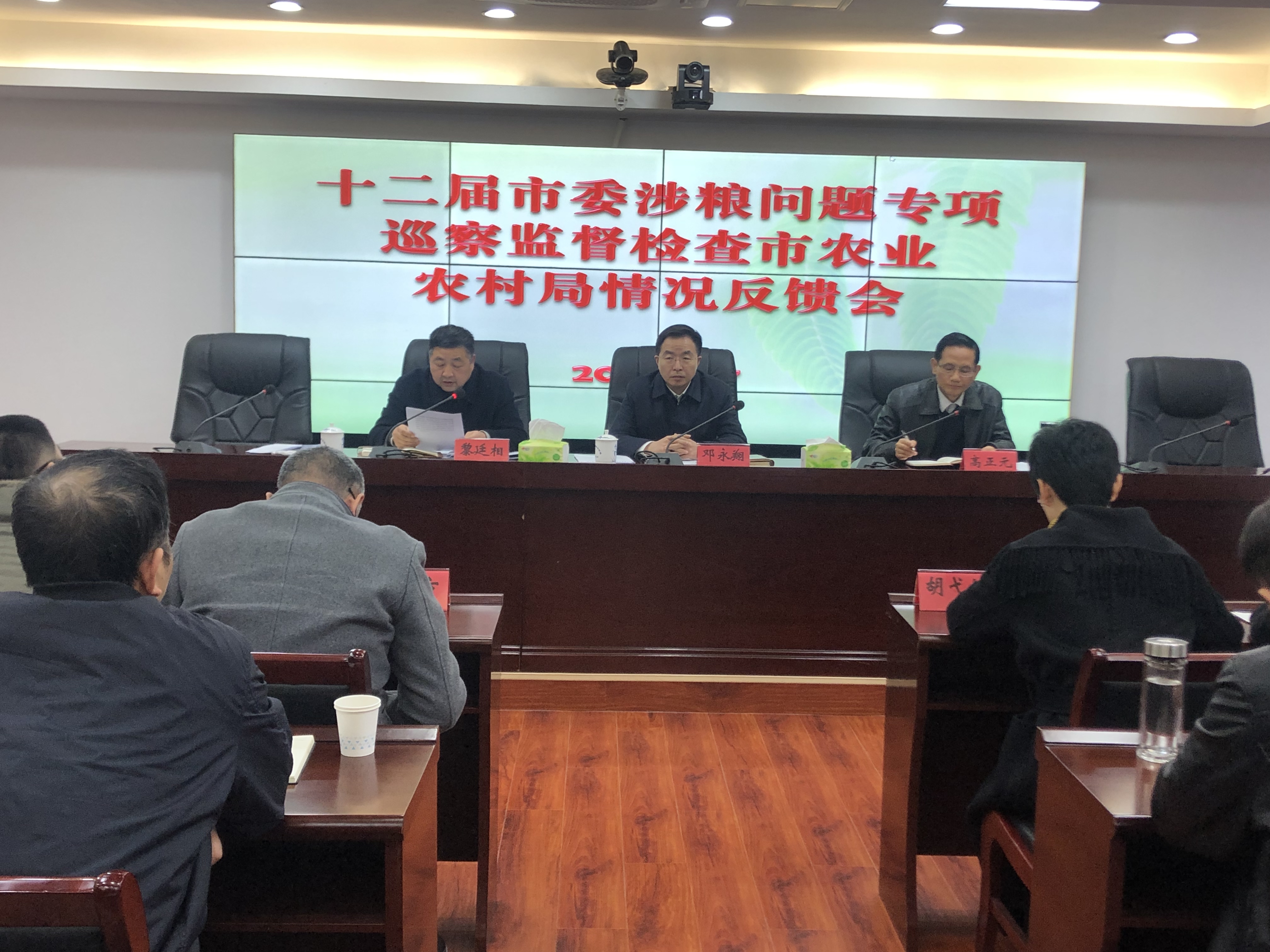 2022年1月27日下午,十二届市委涉粮问题专项巡察监督检查景德镇市农业农村局情况反馈会召开。会议传达学习了习近平总书记关于粮食安全重要讲话、重要指示批示精神。市委常委、常务副市长邓永翔带队出席反馈会议,对抓好巡察整改提出要求。市委涉粮问题专项巡察监督检查组组长高正元向市农业农村局领导班子反馈巡检情况。市农业农村局党组书记、局长黎廷相主持反馈会议并作表态发言。